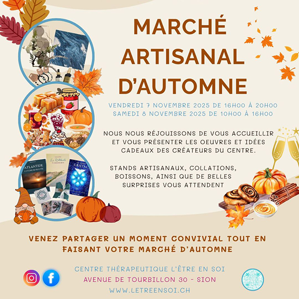 Retrouvez moi le vendredi 7 Novembre de 16h à 20h et le samedi 8 Novembre 2025 de 10h à 16h au Centre Thérapeutique l’Être en Soi à Sion pour le Marché d’Automne, je présenterais des objets et quelques tableaux , dont le bénéfice des ventes iront pour la levée de fond 2026 de l’Association le Petit Algonquin.